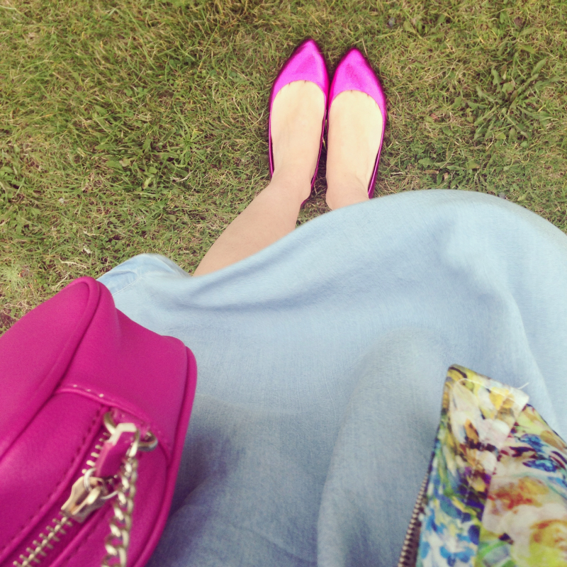 Zara Floral Bomber Jacket (old)// H&M Conscious Collection Light Denim Dress (similar here)// Zara Pink Metallic Flats (old).