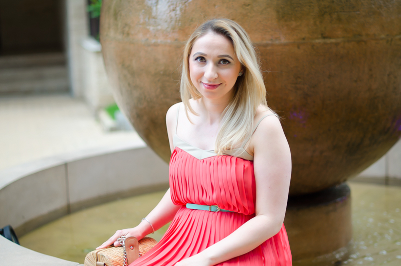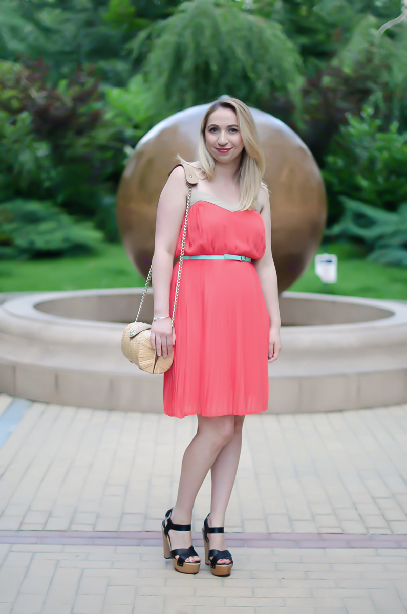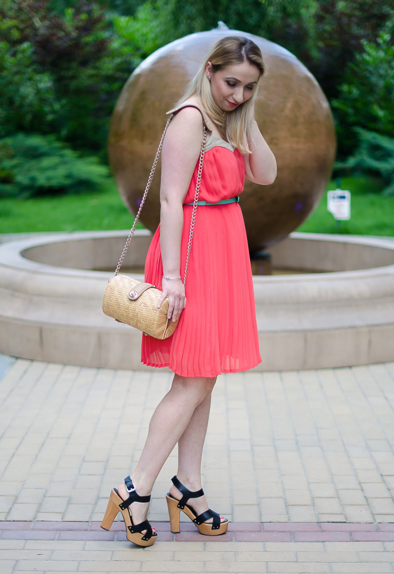 Mango Pleated Coral Dress// Zara Sandals// Zara Bucket Bag.