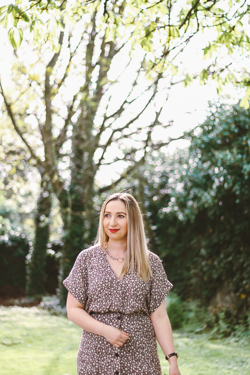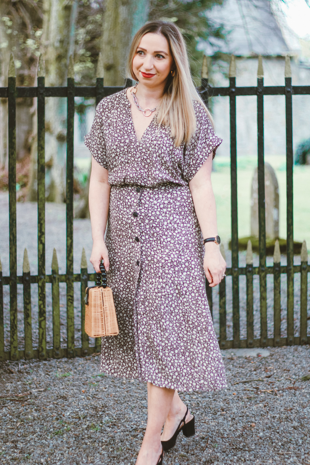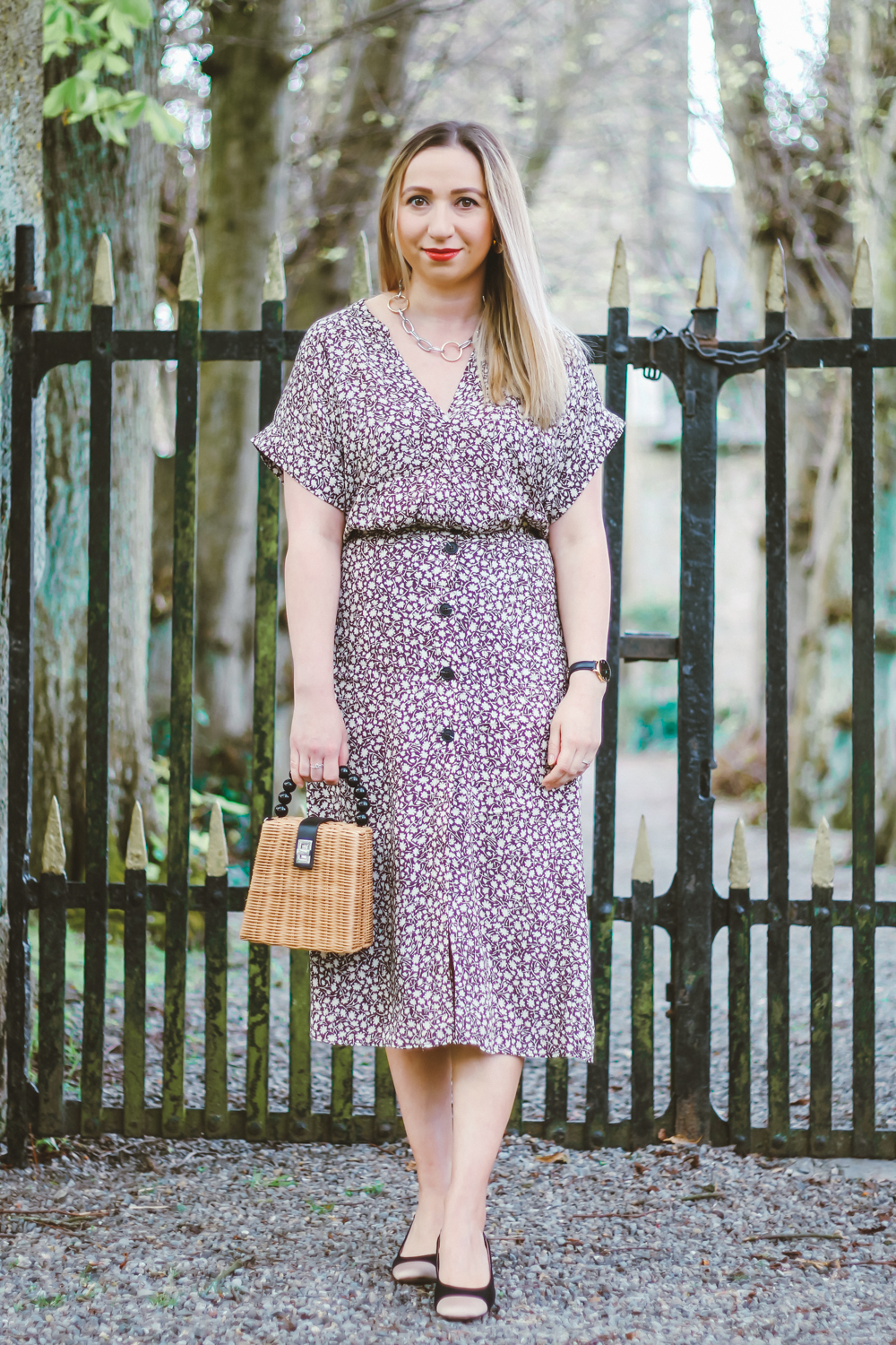 I loved the whole demure, elegant vibe from it. The pattern is a ditsy floral print on brown crinkled viscose. Its available in other three color options, however im a pattern kinda girl. The has dolman sleeves and a v-neck, its quite long and comfortably oversized. The is a calf-length and has an elasticated waistband. Its not lined, however the fabric is not see trough. It closes with buttons at the front, with a high slit.