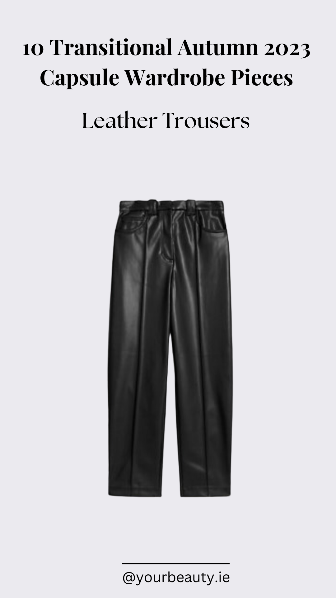 Leather trousers are a bold statement for fall 2023. Their sleek texture adds a hint of luxury to any outfit, making them a must-have for your capsule wardrobe.