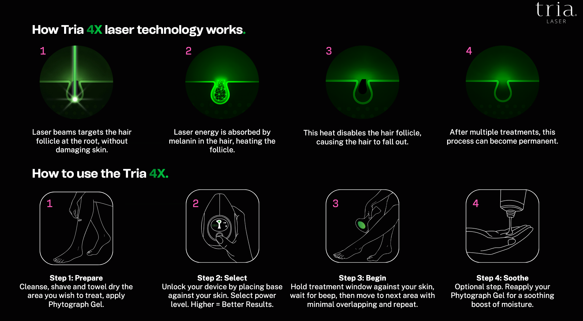 As the only FDA-cleared at-home laser for permanent hair reduction, the Tria 4X is designed for both safety and ease of use.